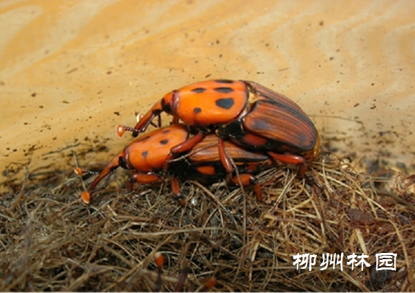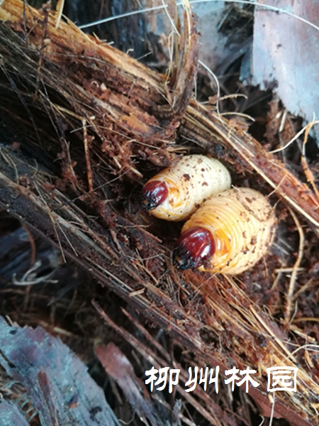 红棕象甲是一种检疫性害虫,在柳州一年可发生2-3代,而且世代重叠。雌成虫产卵于寄主腋间或树干的伤口、树皮的裂缝处,卵散产。幼虫孵化后随即钻于树干内,钻食柔软组织,树干纤维被咬断且残留在虫道内,严重时可使树干成为空壳。当幼虫钻食生长点时,初期使心叶残缺不全,最终使生长点腐烂,造成植株死亡。现在正值第二代幼虫盛发期,寄主植物有老人葵、霸王棕、伊拉克蜜枣、棕榈、国王椰、中东海枣、大王椰、加拿利海枣、假槟榔、针葵、银海枣、蒲葵等12种。