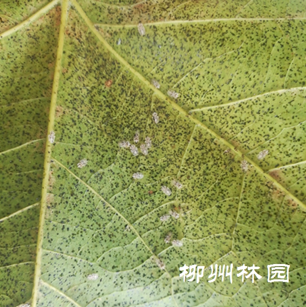 方翅网蝽是半翅目网蝽科网蝽属害虫。近期高温干旱天气,最适宜此虫发生,在柳州主要危害法国梧桐,该虫主要以成虫和若虫刺吸寄主树木叶片汁液,受害叶片正面形成许多密集的白色斑点,叶背面出现锈色斑,从而抑制寄主植物的光合作用,影响植株正常生长,导致树势衰弱。受害严重的树木,叶片枯黄脱落,严重影响景观效果。