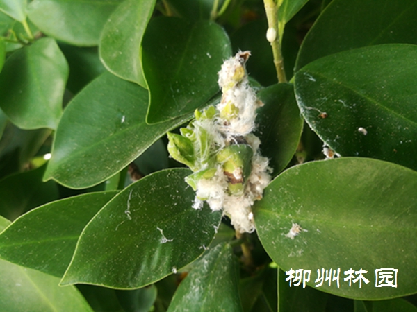 华卵痣木虱属同翅目木虱科。以成、若虫为害新梢和叶片,受害严重时,叶片皱缩,逐渐变色脱落。被害虫分泌物污染的叶片常会诱发煤烟病;其分泌的白色棉絮状物影响观赏。近期在柳州有盛发趋势,其寄主植物有小叶榕,垂榕等。