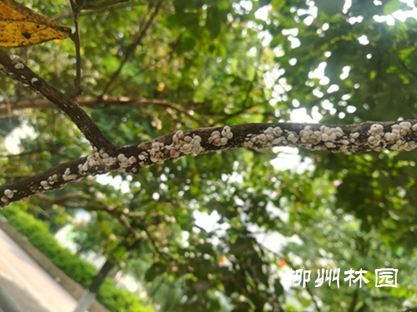 紫薇绒蚧在柳州目前主要危害紫薇,以成虫和若虫寄生于植物枝干和叶片,吸食汁液。其排泄物会诱发煤污病,影响植株的生长发育和开花效果,严重时能致全株死亡。