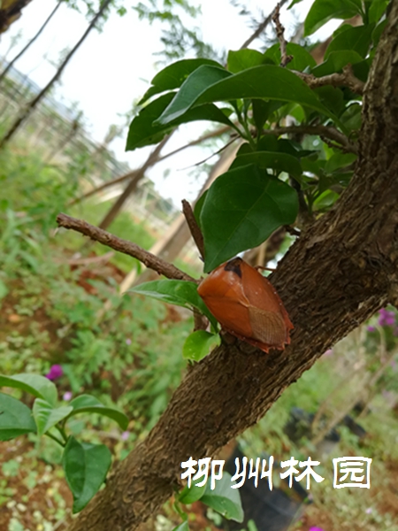 栾树蝽蟓属半翅目,蝽科。在柳州主要危害栾树,有部分苗木目前正值盛发。该虫以成虫、若虫将针状口器插入嫩枝、幼茎、花果和叶片组织内,吸食汁液,造成植株生长缓滞,枝叶萎缩,甚至花果脱落。