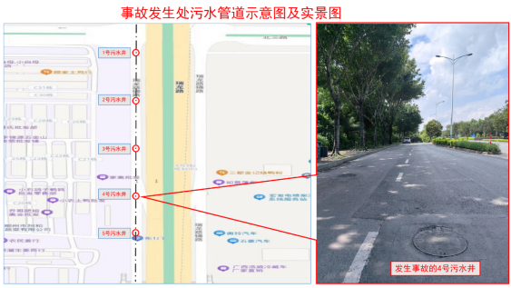 事故发生点位于柳南区瑞龙路海吉星东1门往西外环路辅道上一处污水井,事发污水管道呈南北走向,从西外环路口到海吉星东1门共有5个污水井,事故发生在4号污水井。(见图1)