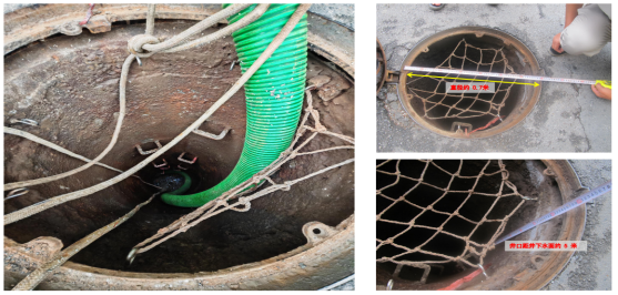 2025年7月18日13时许,排水维护所施工员周某、司机林某榕,劳务组人员何某新、何某元、何某国开始进行疏通海吉星大门至西外环污水管网堵塞任务。作业人员首先逐一打开污水井盖排查了污水井内堵塞情况,发现4号污水井内下方有静止的污水和垃圾,5号污水井内污水很满,判断出堵塞的位置在4号污水井内,于是计划对4号污水井进行疏通。13时39分,林某榕驾驶吸污车停在4号污水井前,何某元打开4号污水井盖,随后作业人员做疏通前准备工作,但未对污水井内气体情况进行检测。13时48分,何某元站在污水井旁将高压水枪放到井内对井内进行冲洗疏通,随后将高压水枪从井内取出。随后何某元从吸污车驾驶室内取出水裤穿上,戴上防毒面具,做下井前准备作业。13时51分,周某、何某新对何某元穿戴防毒面具情况进行了检查。13时52分21秒,何某元手拿高压水枪坐在污水井边缘准备下井,周某、何某新在吸污车后侧,何某国在吸污车左侧,林某榕站在吸污车左侧人行道上。13时52分30秒,何某元沿着爬梯下到污水井内,下到井内第五个爬梯处何某元无力抓握爬梯掉到井底。(见图5、图6)