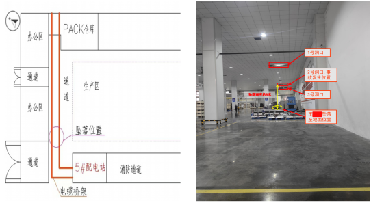 事故发生地位于柳州市鱼峰区秀水三路6号柳州国轩电池有限公司2#厂房PACK线车间,顶部为彩钢屋顶,车间内设置有白色铝制扣板的吊顶,吊顶板距地面高度约8米。靠西面墙地面堆放有“魔塔”储能件,吊顶由北至南可见3个洞口。其中1号和3号洞口下方各有一台吊运母线槽的升降平台,为从业人员吊运母线槽和人员上下通道。2号洞口为王某2坠落过程中踩踏脱落形成。(见图1)
