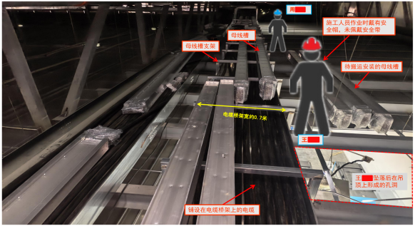 2#厂房的彩钢屋顶是由“工”字型槽钢大梁支撑,吊顶扣板通过螺栓焊接固定在槽钢大梁上。涉事槽钢大梁上有2条电缆桥架,宽度约0.7米,桥架内铺设有电缆,维修人员可以在电缆桥架上行走;西侧电缆桥架上已焊接有母线槽支架,支架上已放置部分母线槽,旁边有待搬运到支架上的母线槽。事故发生时,王某1、王某2、杨某某、孙某、周某某等5名从业人员均戴了安全帽和穿了反光背心,但未佩戴安全带。(见图2)