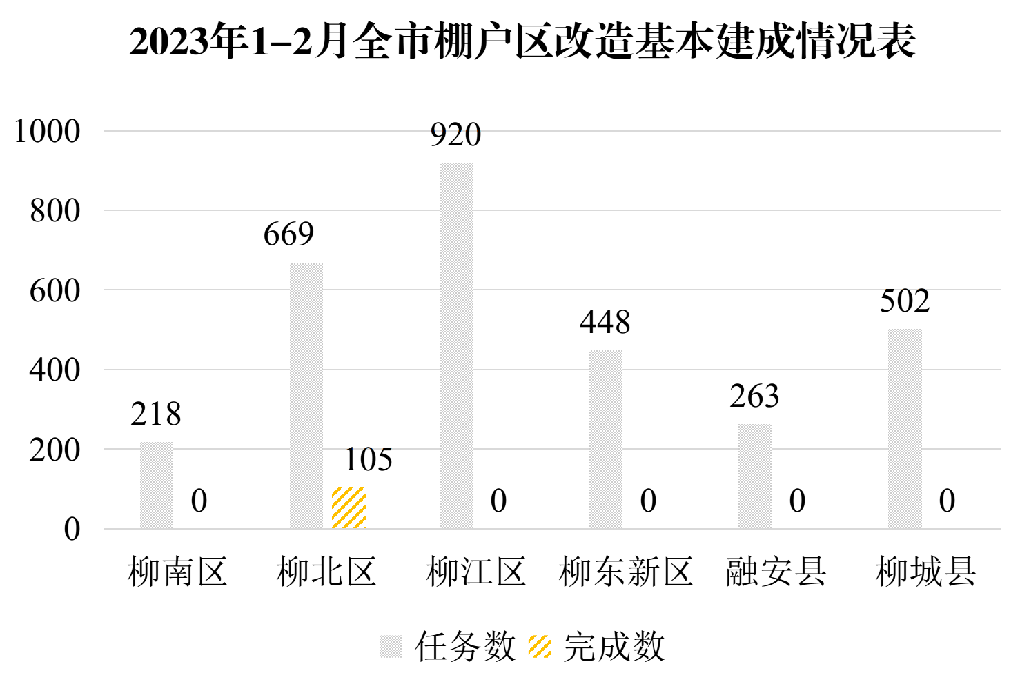 2023年,自治区预下达柳州市棚户区改造基本建成目标任务为3020套。截至2023年2月24日,已建成105套,完成年度目标任务的3.48%。其中,建设进度较快的县(区)有:柳北区,尚未复工的县(区)有:柳城县、柳东新区。