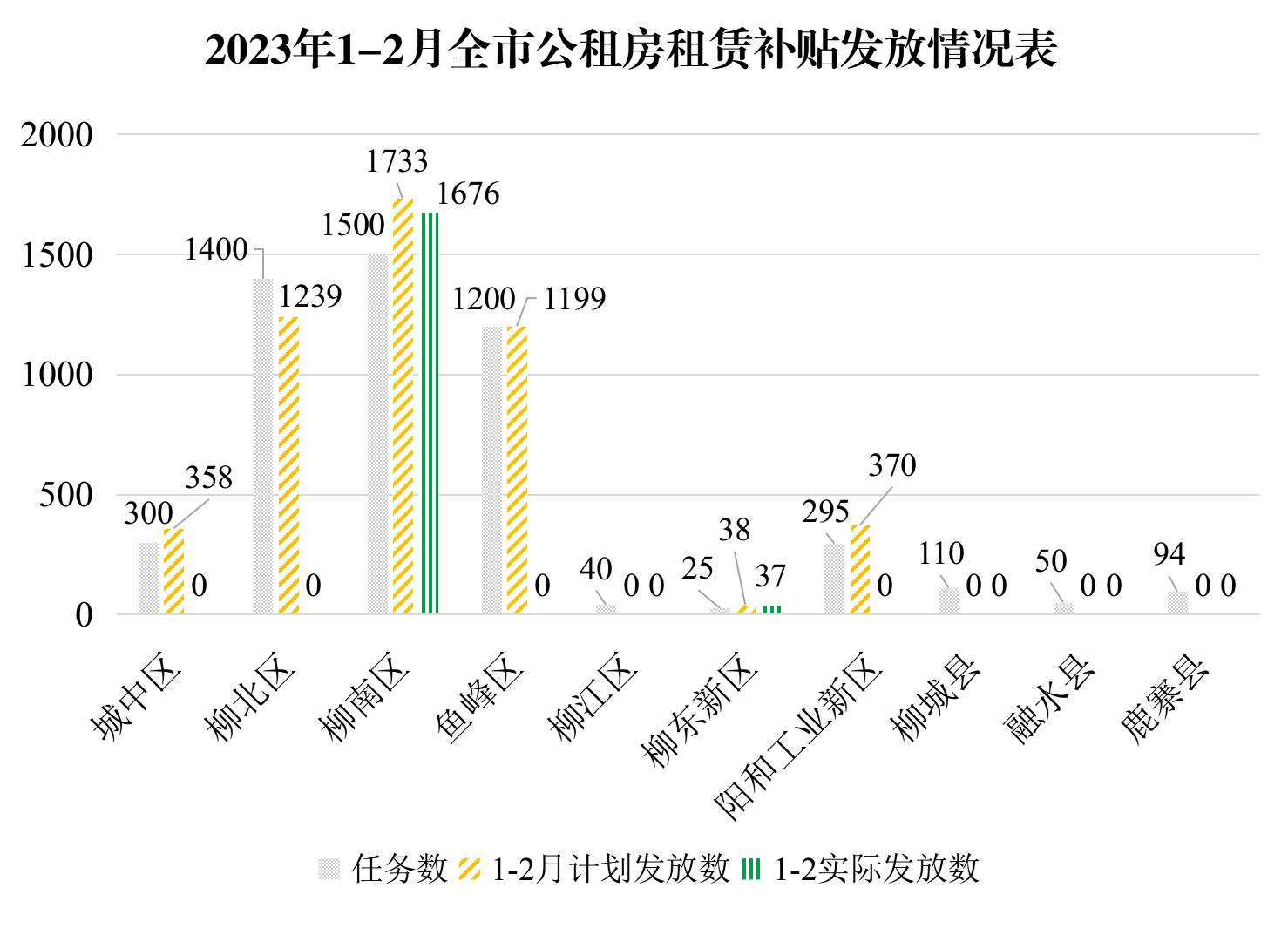 2023年,自治区预下达柳州市公租房租赁补贴发放目标任务为5014户。截至2023年2月24日,已发放1713户,完成年度目标任务的34.16%。其中,发放进度较快的县(区)有:柳南区、柳东新区,发放进度较慢的县(区)有:城中区、柳北区、鱼峰区、柳江区、阳和工业新区(北部生态新区)、柳城县、融水县、鹿寨县。