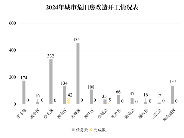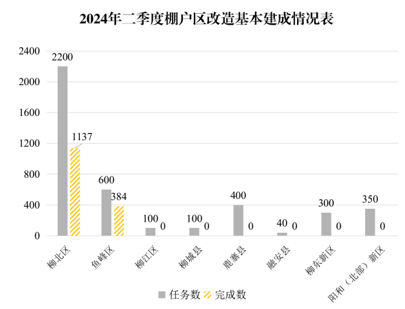 2024年,自治区下达柳州市棚户区(城市危旧房)改造开工任务为1532套。截至2024年6月30日,已开工47套,完成年度目标任务的3.07%。