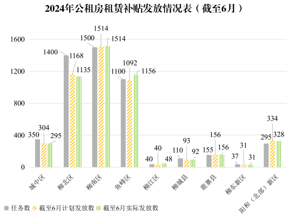 2024年,自治区预下达柳州市公租房租赁补贴发放目标任务4987户。截至2024年6月30日,实际发放4755户,完成年度目标任务的95.35%。