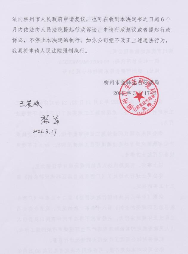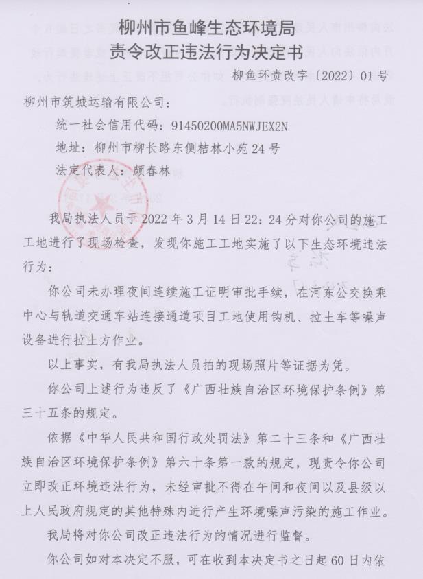柳州市生态环境局责令改正违法行为决定书(柳鱼环责改字〔2022〕01号)柳州市筑城运输有限公司